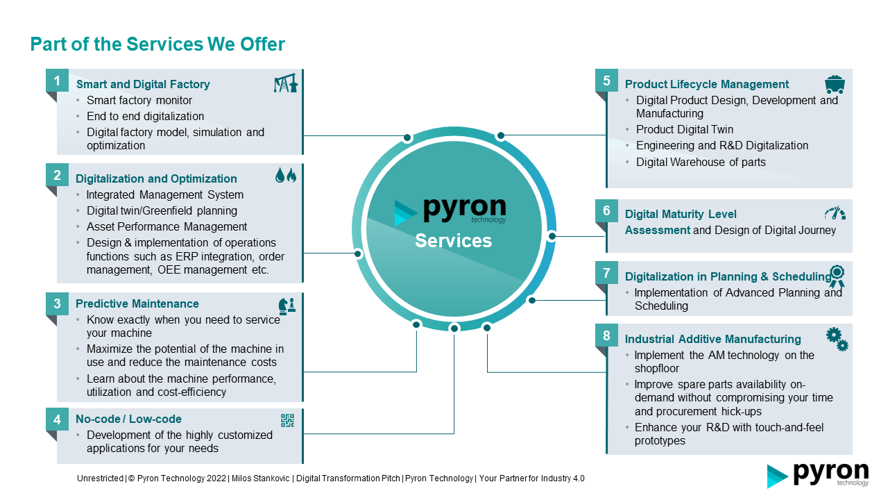 Pyron Technology provides management consultancy services in the domain of overall business digital transformation and a holistic approach to implementing Industry 4.0 high-end technologies and business processes implementing digital thread of the value chain.